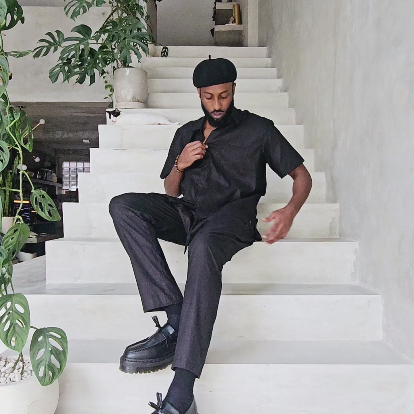 This short sleeve button down shirt is slightly oversized giving it a laid back look and making it very suitable for anyone of any gender to wear.
