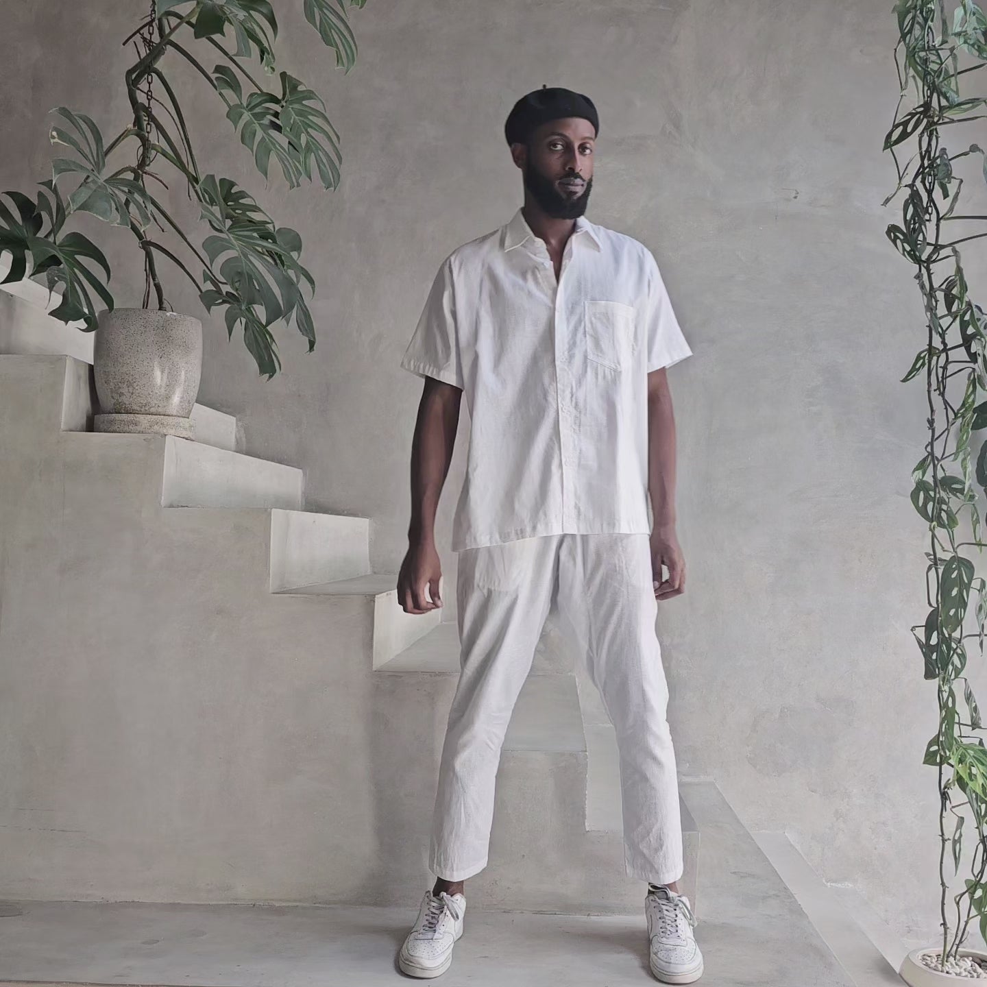 This short sleeve button down shirt is slightly oversized giving it a laid back look and making it very suitable for anyone of any gender to wear.