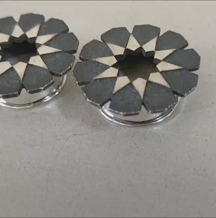 Flesh tunnels for stretched lobes with classic geometric pattern decorating a wide front flare.